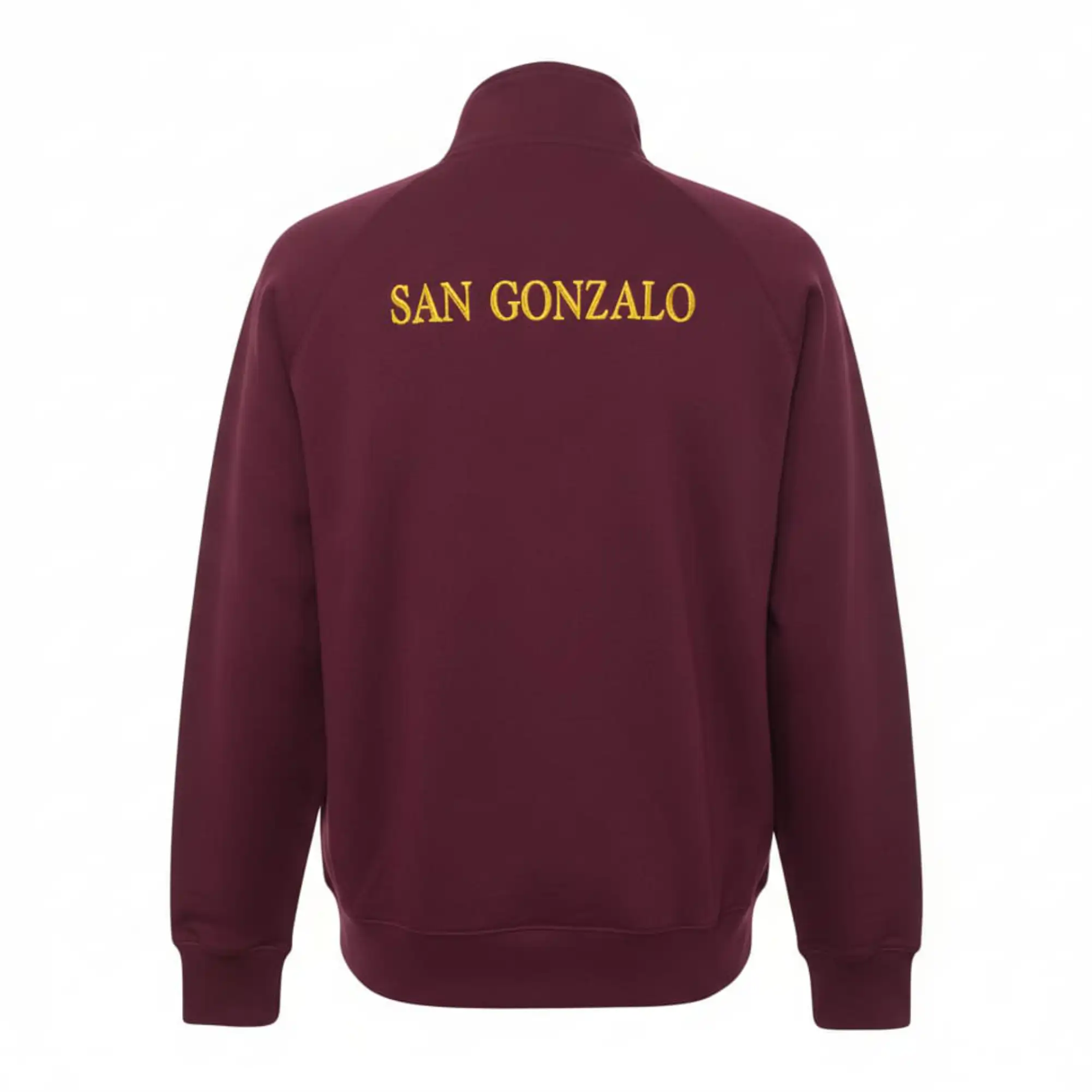 Sudadera bordada con el escudo de la Hermandad de San Gonzalo de Sevilla, con cremallera entera invisible a tono, cuello alto y bolsillos laterales.